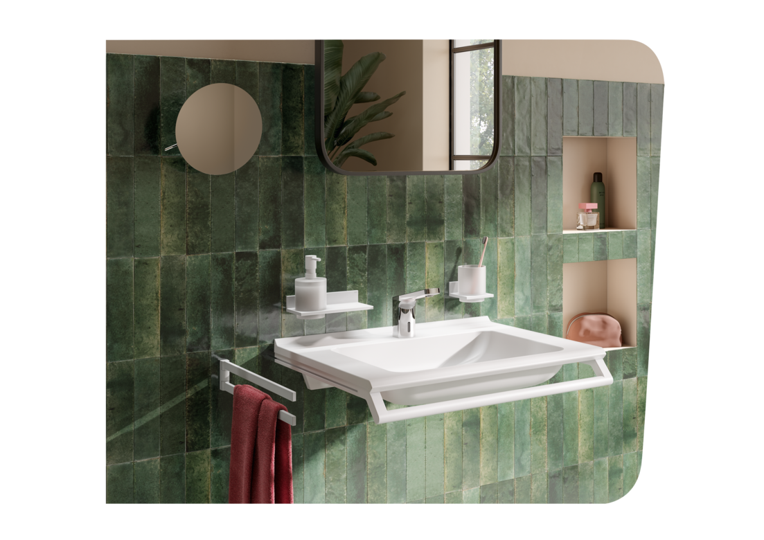 The accessories in our System 900 Q are designed with square shapes and clearly defined radii and proportions. With their delicate and visually light design, they bring out the main elements in your modern bathroom.