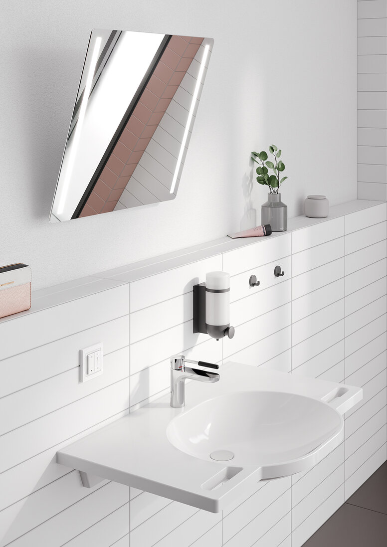 HEWI mirrors complete the ambience of any bathroom. The extended range includes tilting mirrors with black and white frames, innovative LED illuminated mirrors with backlit controls and a new motorised tilting mirror.