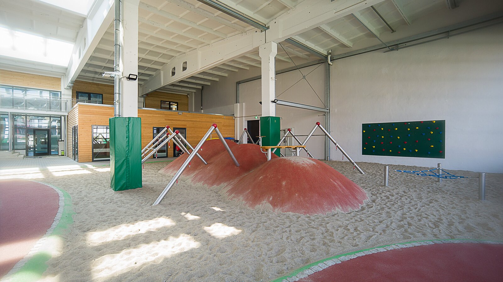 The remaining two-thirds of the total area is occupied by the roofed arcade, which is connected to the outside area by six openable rolling gates. In the indoor play area there are many play and movement possibilities for the little ones: trampolines, climbing wall, sand playground with climbing frame in spider form and an eight-shaped scooter track. When the gates are open, the transition to the outdoor area is smooth and the children can use the natural grass surface and the multifunctional pitch for various sports such as handball, football or basketball.