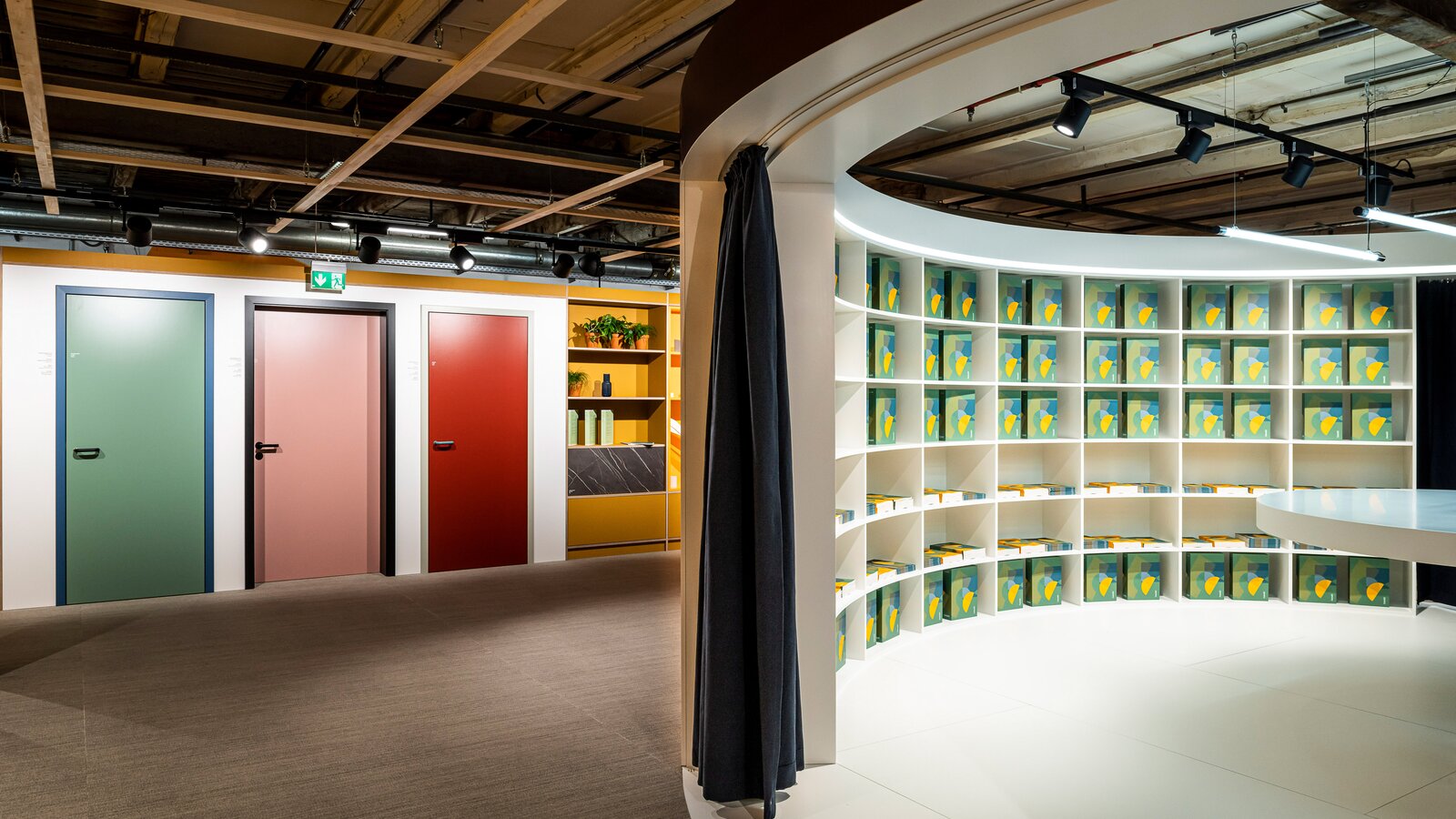 The exhibition is dominated by bold, timeless colors. This forms a design contrast to the construction of the old factory building, which is characterized by steel girders, concrete and stone. Thus, the colors of the exhibition and the simplicity of the industrial building meet.