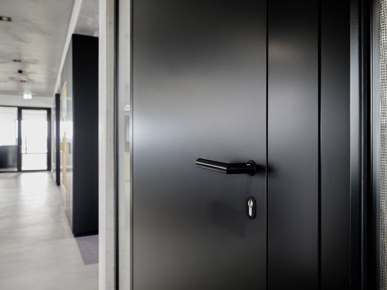 Specifically, these are HEWI's classic S 111, the System 900 with products for sanitary rooms, and S 162 with its straightforward, puristic design. The planners have equipped the factory hall and the associated production areas with continuous stainless steel satin finished products. The administration building features only jet black matt design types, including powder-coated products and robust polyamide door furniture.