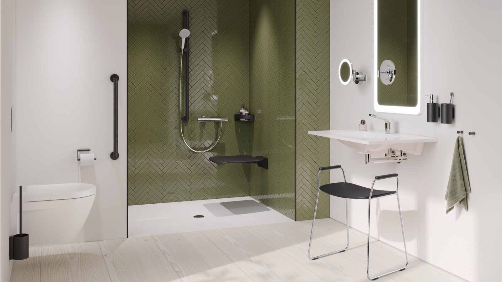 Grâce au siège mobile, l'équipement de douche peut être conçu de manière flexible. Le siège de douche mobile est simplement encliqueté dans la plaque de montage installée de façon permanente lorsque cela est nécessaire.